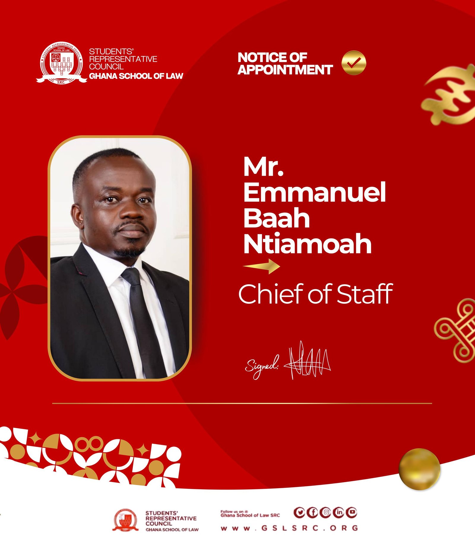 In accordance with best practices, the President of the SRC, Nana Opoku Ware, formally notifies the student body of the appointment of Mr. Emmanuel Baah