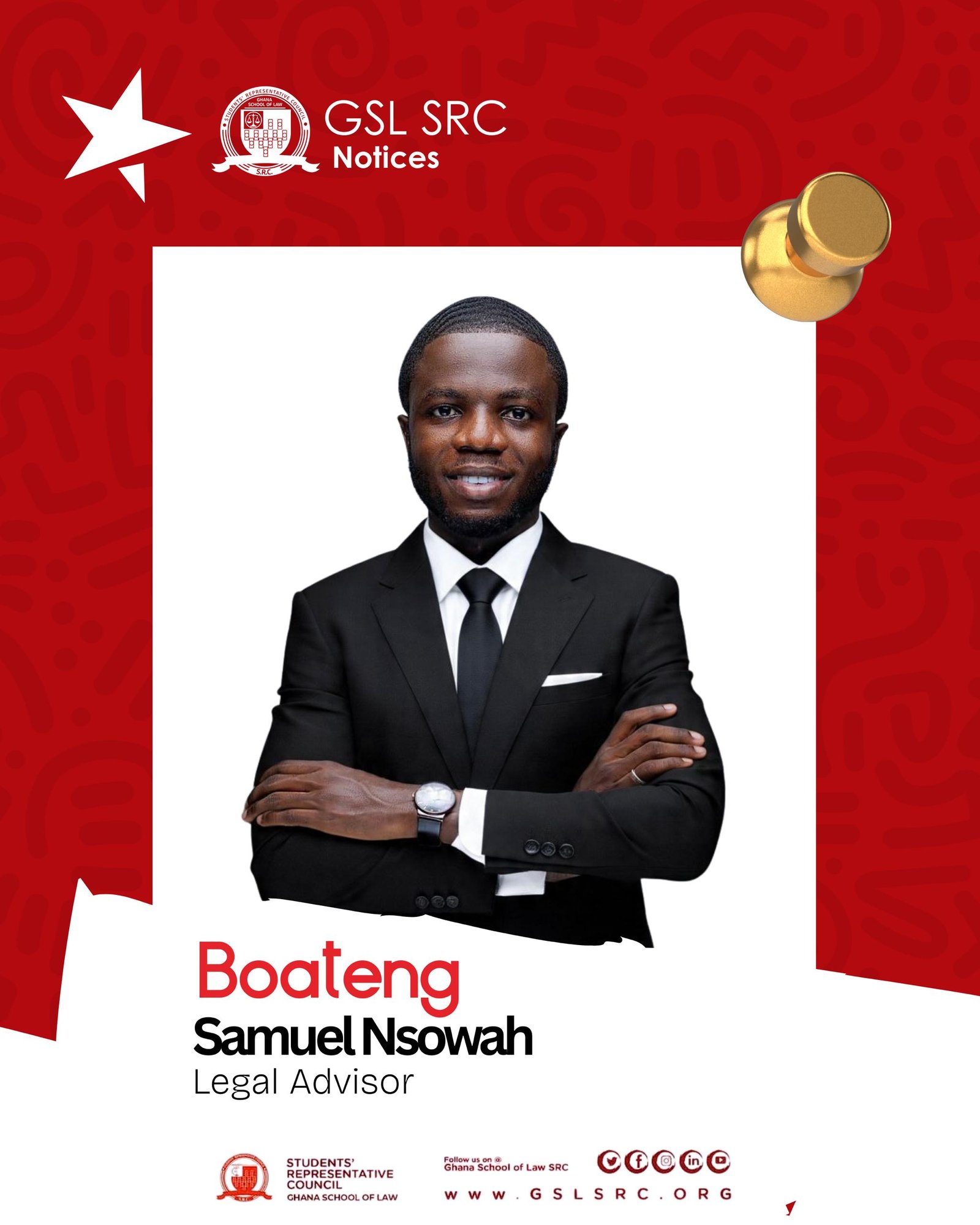 GSL SRC Legal Advisory Announcement The GSL SRC is pleased to introduce Boateng Samuel Nsowah as the new Legal Advisor. Mr. Nsowah will provide essential